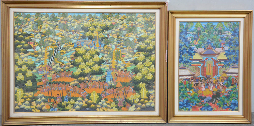 Lotto di due dipinti balinesi, misure diverse, in cornici (difetti)