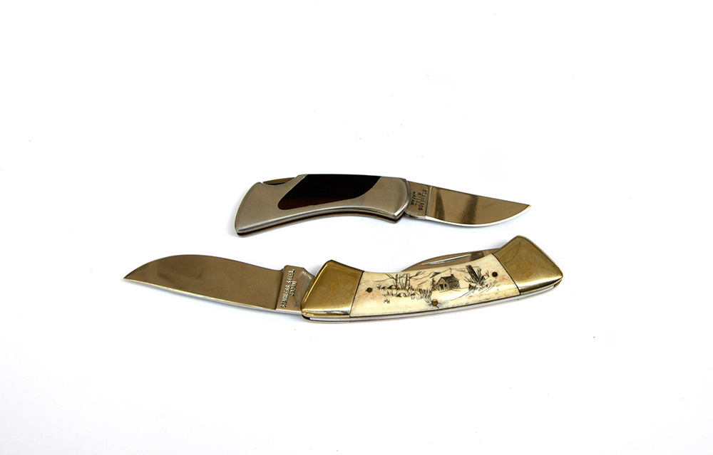 (Historica) Lotto composto da due coltelli pieghevoli, uno dei quali con incisione sul manico in osso raffigurante paesaggio americano, marca Olsen (USA). In confezione originale.