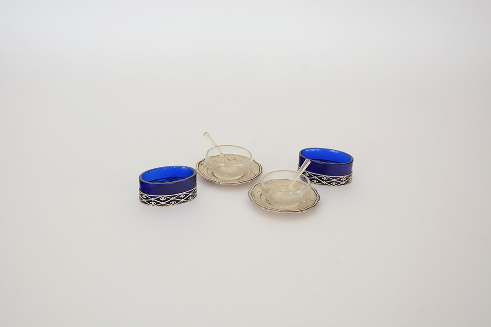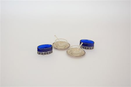 Lotto composto da due coppie di saliere in argento e vetro (d. cm 8; cm 6,5) (difetti)