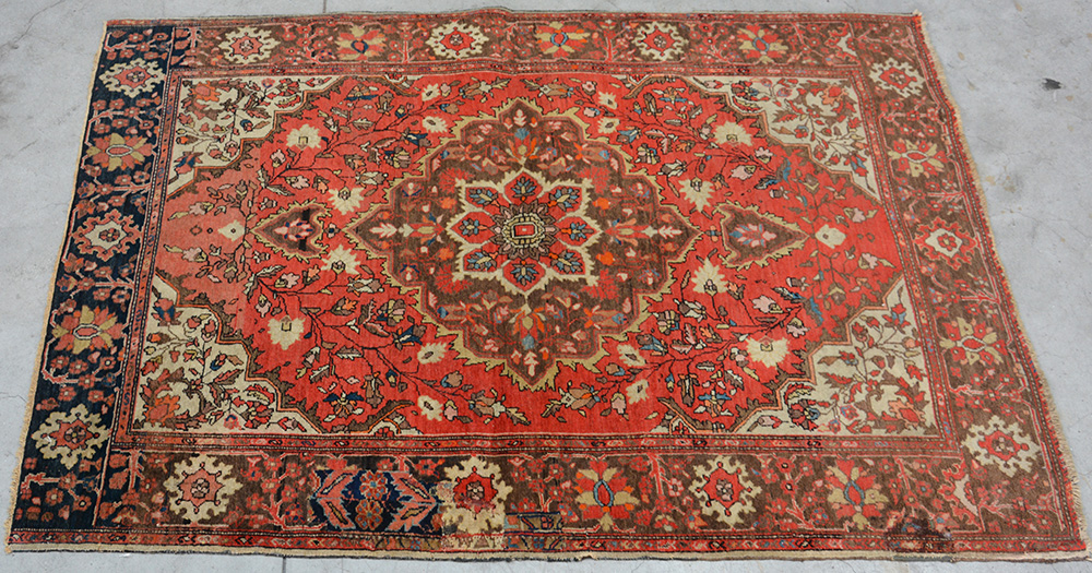 Tappeto Sarouk, Persia fine sec. XIX. Disegno a medaglione rosso e nocciola su campo color rosso decorato da rami fioriti (cm 143x101)(difetti, restauri e inserti)
