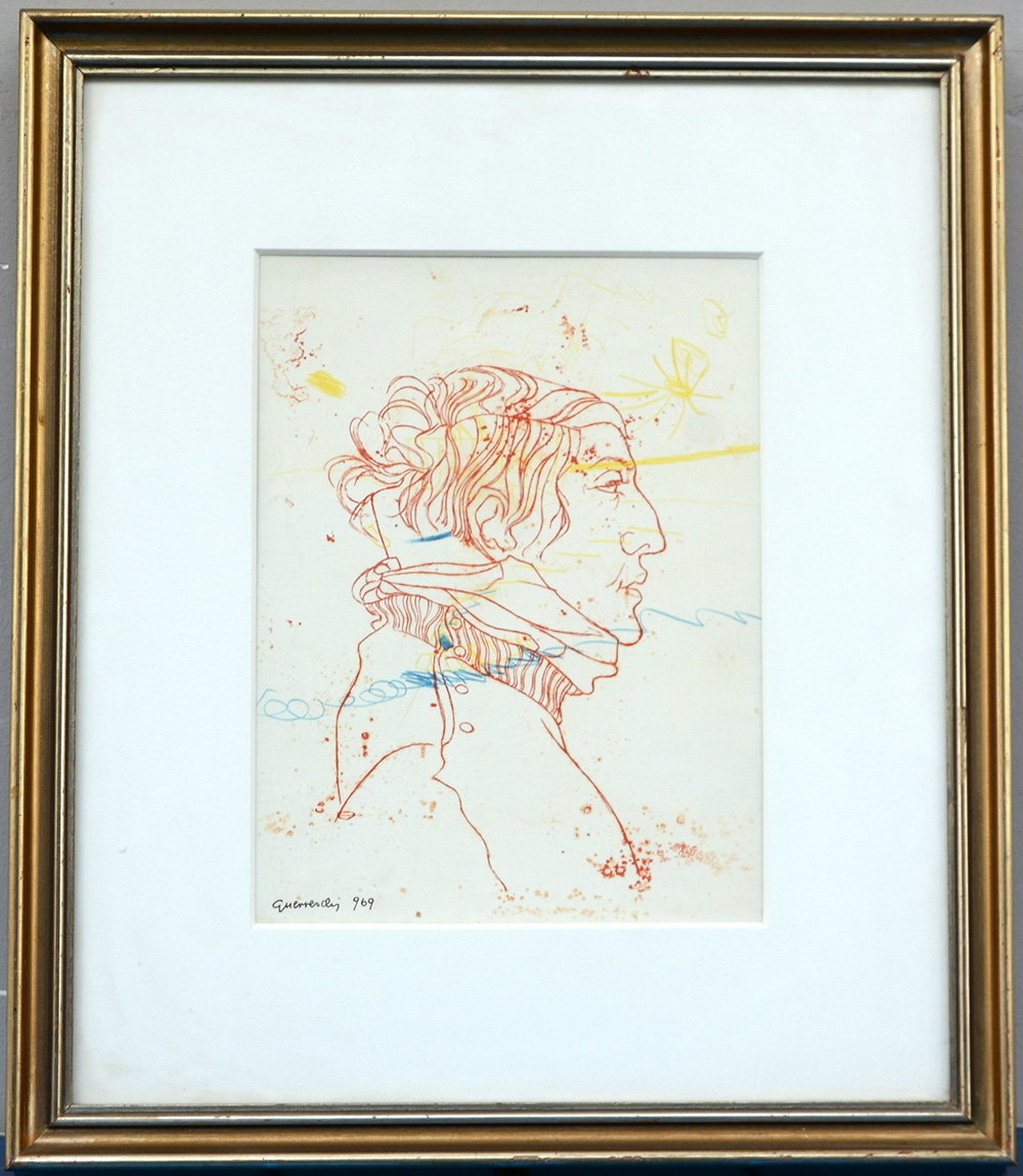 Giuseppe Guerreschi (Milano 1929- 1985)"Il figlio Massimo" 1969, tecnica mista su carta (cm 32x25) firmata e datata in basso a sinistra. Al retro etichette della Galleria Mutina, Modena e della Galleria Documenta - Arte Varia, Torino. In cornice. Opera accompagnata da autentica su fotografia della Galleria Documenta, Torino