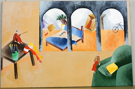 Federica Perazzoli Sorengo 1966 "Paesaggio con figure" acrilico su tela (cm 100x150) firmato in basso a destra.