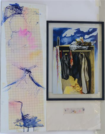 Lotto composto da una riproduzione di un'opera di Guttuso, in cornice e un'opera moderna di autore ignoto, tecnica mista su masonite e relativo bozzetto preparatorio su carta, misure diverse(lievi difetti)