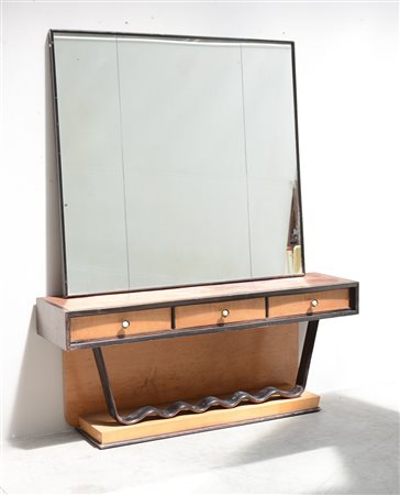 Consolle da ingresso impiallacciata in legno diversi, con base a slitta e specchiera. Italia, anni 40 (cm 150x181x38) (difetti e mancanze)