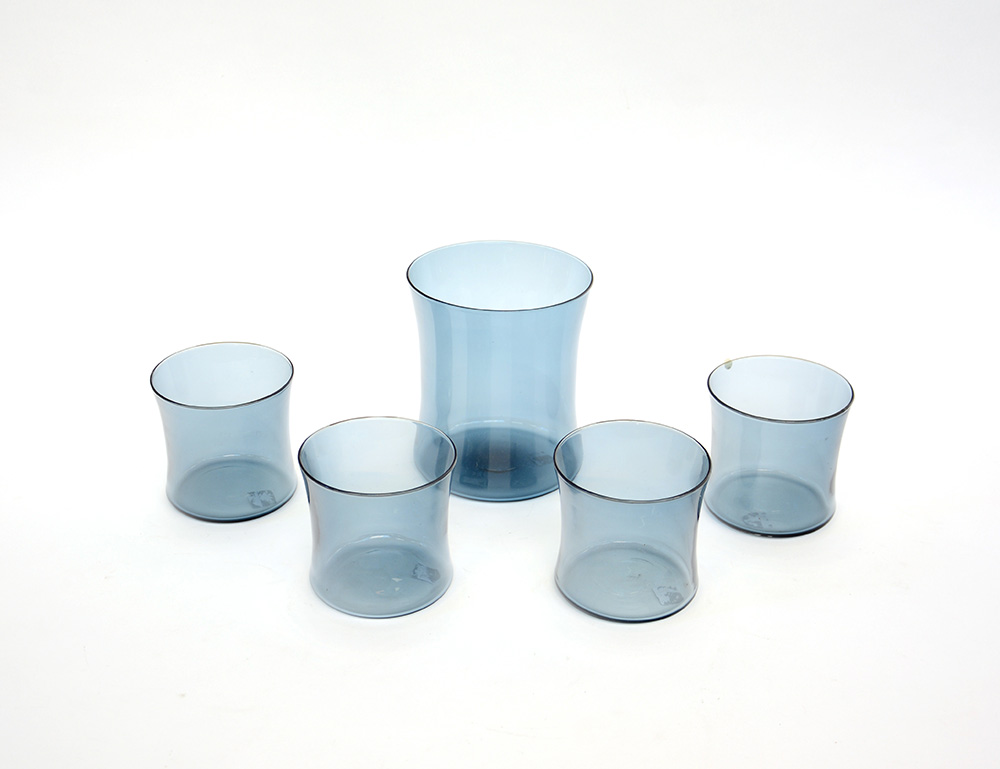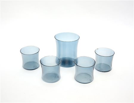 Timo Sarpaneva (Finlandia 1926- 2006)Quattro bicchieri con caraffa in vetro trasparente azzurro. Manifattura Iittala, Finlandia, anni 50 (h cm 9 e h cm 15) Bibliografia: B. Polster, Design in Scandinavia, Rcs, Milano 1999, p. 329