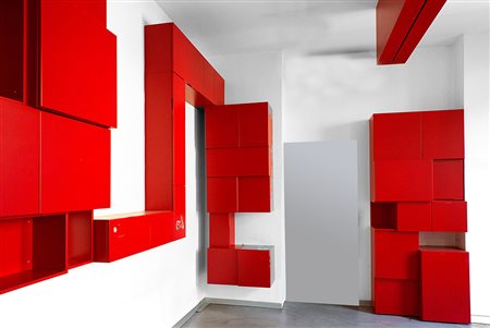 Mobile modulare in legno laccato rosso ad ante, cassetti e ribalta. Produzione recente (difetti)