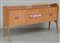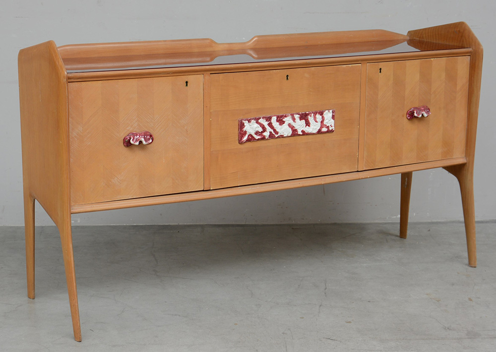 Mobile impiallacciato in legno chiaro a tre sportelli con maniglie e decorazioni in ceramica. Italia, anni 50 (cm 172x99x47) (difetti)