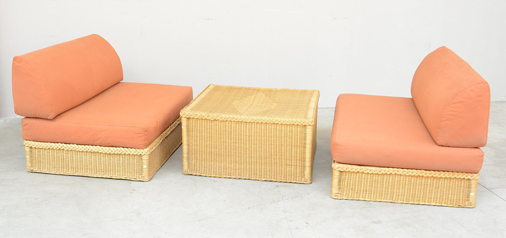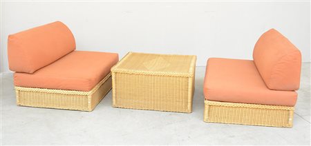 Mario Bonacina Fornitura da veranda composta da due divanetti con struttura in midollino completi di materassini e dorsali e un tavolino en suite. Disegno su misura. Esecuzione Vittorio Bonacina, Lurago d'Erba, 1981 (cm 110x20x80 e cm 80x40x80) (lievi difetti) Provenienza: Villa Maggio, Garda