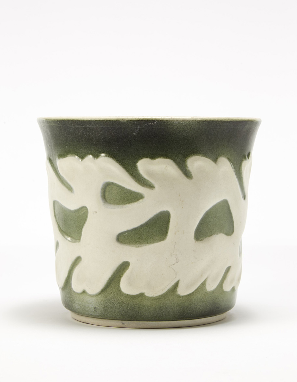 Giovanni Gariboldi ( 1908- 1971)Cache-pot in terraglia modellata a colaggio, smaltata in crème e verde con decorazione vegetale a rilievo. Manifattura Richard-Ginori San Cristoforo, Milano, 1950 ca. Marcato in verde sotto la base "Richard Ginori - made in Italy", numerali "10-52-1" e "1376" e numerale incusso 7859 (h cm 19) (lievi difetti)
