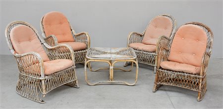 Fornitura da veranda in bambù composta da quattro poltrone e un tavolino, completa di cuscini. Esecuzione Gervasoni, Italia, anni 80 (gravi difetti) Provenienza: Villa Maggio, Garda
