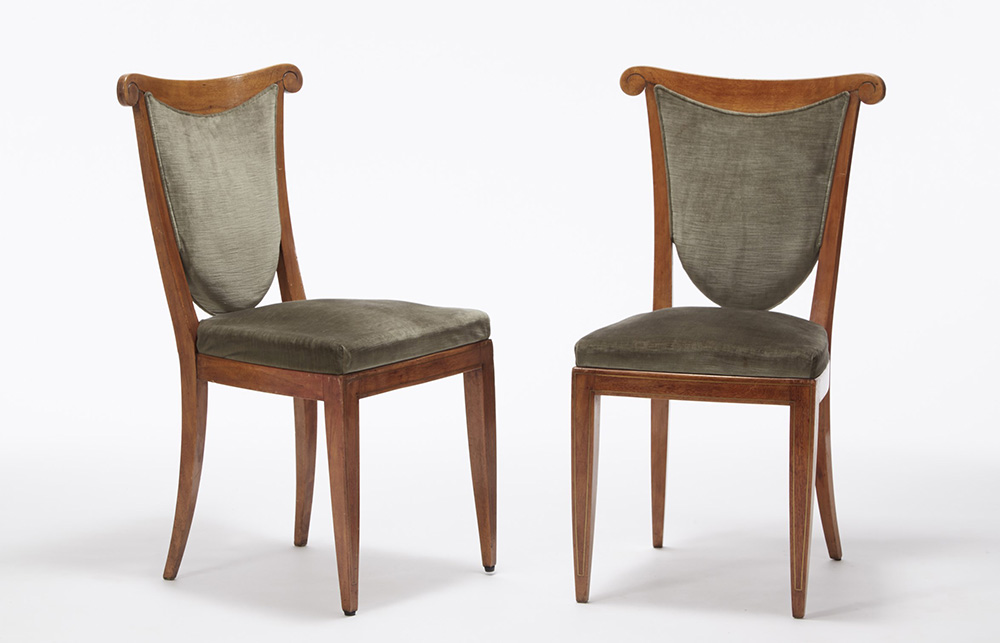 Coppia di sedie in faggio ascrivibile alla cerchia di architetti del Novecento milanese. Schienali intarsiati a ricciolo, gambe e fasce filettate in ottone, seduta e schienale imbottiti rivestiti in velluto. Milano, anni 30 (cm 52x93x50) (lievi difetti)