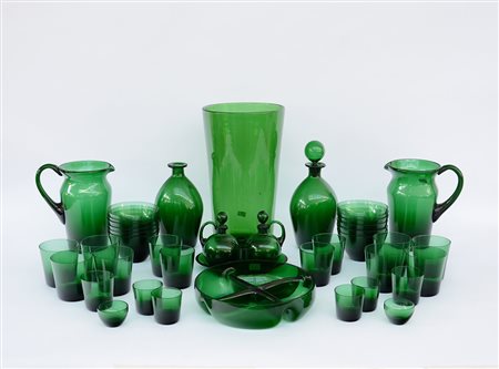 Parte di servizio da tavola in vetro verde composto da due brocche, due bottiglie, un vaso, quarantotto bicchieri di misure diverse, oliera, acetiera e saliera, antipastiera e dodici coppe da macedonia. Italia, anni 70 (difetti e mancanze)