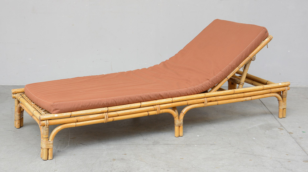 Sdraio modello "Villa d'Este" con struttura in bambù e testiera regolabile, completa di materassino. Esecuzione Vittorio Bonacina, Lurago d'Erba, 1981 (difetti) Provenienza: Villa Maggio, Garda
