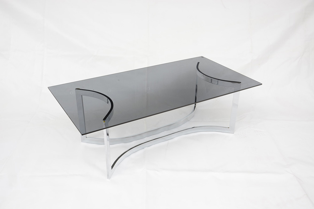 Tavolino basso con struttura in metallo e piano rettangolare in vetro fumè....