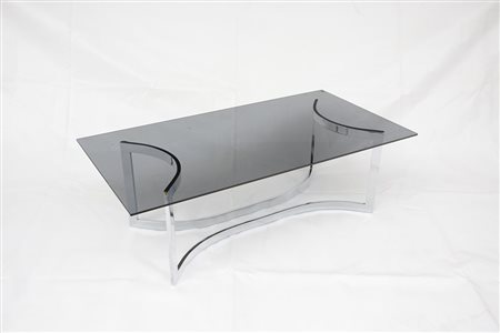 Tavolino basso con struttura in metallo e piano rettangolare in vetro fumè. Italia, anni 70 (cm 125x41x65) (difetti)