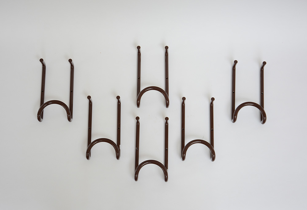 Lotto composto da sei appendiabiti in metallo smaltato marrone (lievi difetti)