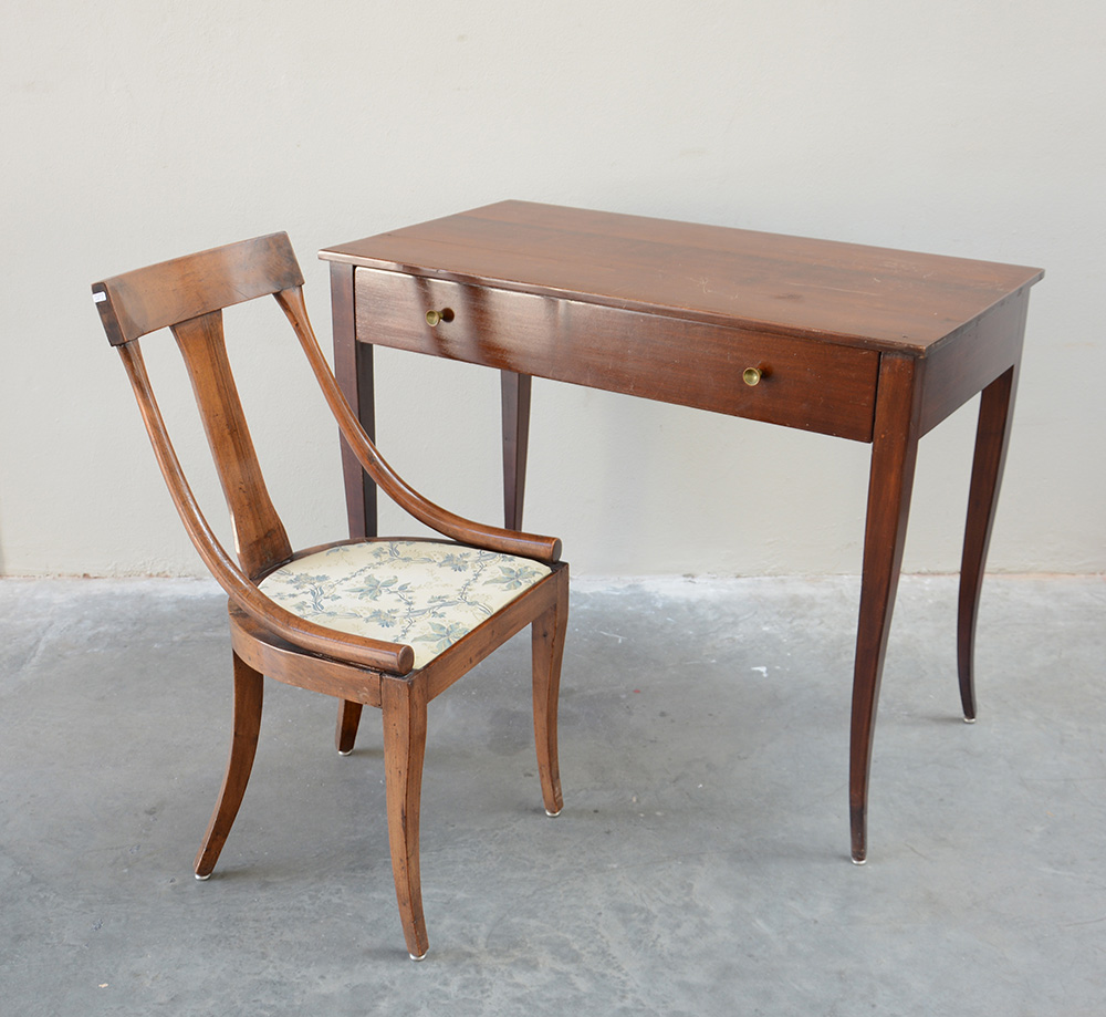 Lotto composto da una scrivania a un cassetto nella fascia e da una sedia a gondola in legno massello. Italia, prima metà sec XX (cm scrivania 100,5x80x55) (difetti)