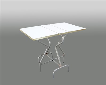 Tavolo apribile in tubolare metallico cromato rivestito in formica bianca....