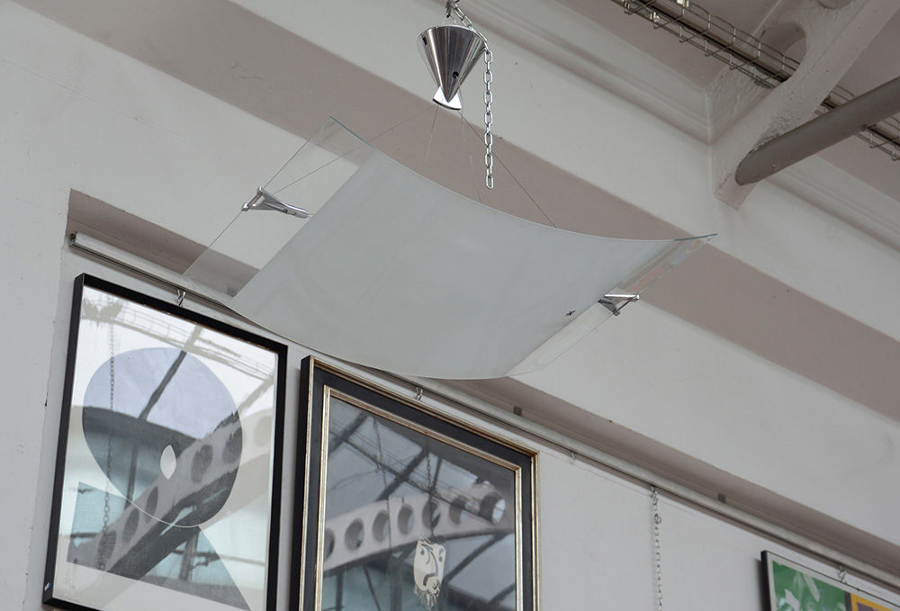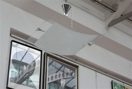 Franco Raggi Lampada a sospensione modello "Velo". Produzione Fontana Arte, Milano, 1988. Vetro curvato e sabbiato, fusione di alluminio e cavi di acciaio (cm 77,5x53x59,5) (lievi difetti e mancanze)