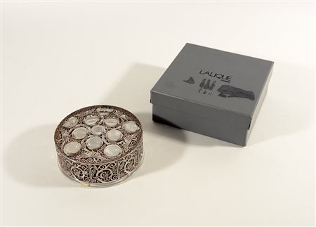 Lalique, Francia Scatola in vetro modello "Roger" decorata con tralci d'uva e pavoni di gusto Liberty. Produzione recente. Marcata alla base. Completa di scatola originale (d cm 13) (lievi difetti)