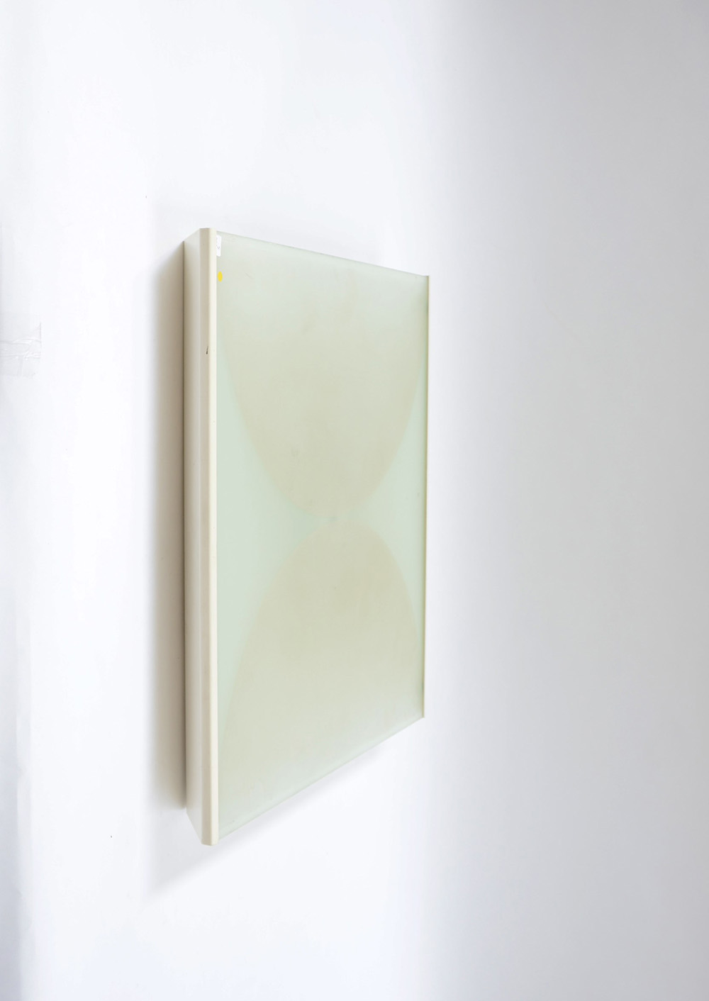Bobo Piccoli (Milano 1927-Milano 1981)Lampada da parete modello "Clessidra". Produzione Fontana Arte, Milano, anni 70. Struttura in metallo verniciato e diffusore in vetro lattimo e smerigliato (cm 50x50x7) (difetti)