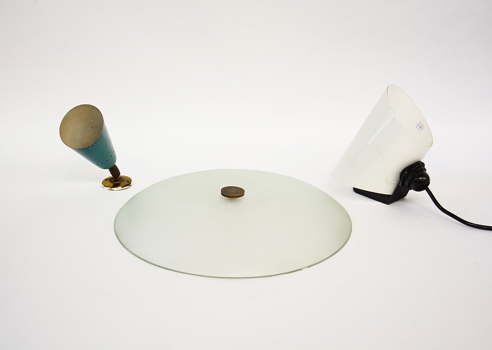 Lotto composto da una lampada in ottone e alluminio laccato celeste, una lampada da tavolo in metallo e vetro incamiciato lattimo, e da un diffusore in vetro stampato con vite di chiusura in metallo facenti parte di una plafoniera (misure diverse) (difetti)
