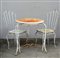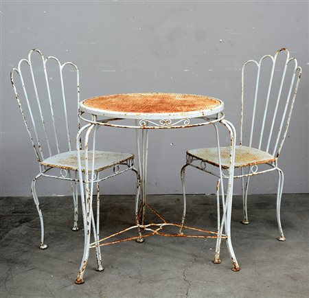 Fornitura da giardino in ferro battuto e traforato composta da un tavolino tondo (d cm 64) e due sedie (difetti)