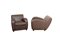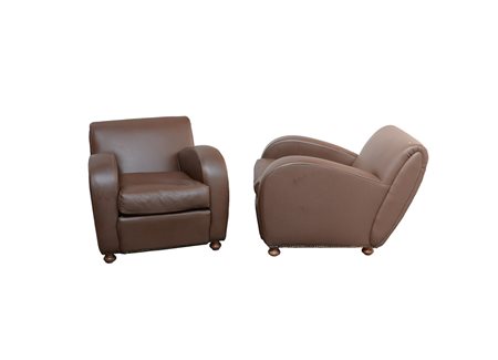 Coppia di poltrone imbottite di gusto Déco rivestite in pelle marrone. Sec XX...