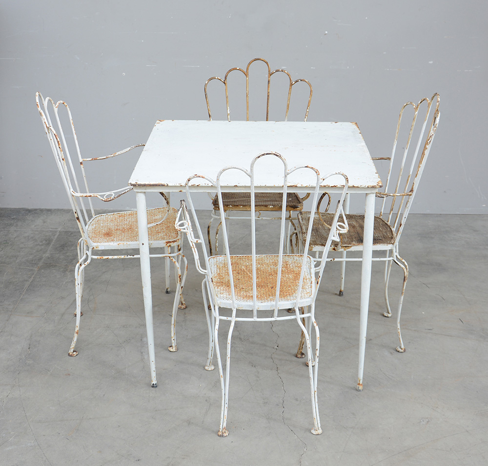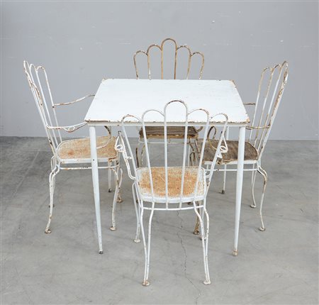 Fornitura da giardino in ferro battuto smaltato bianco composta da un tavolo quadrato (cm 80x76x80) e quattro poltroncine (difetti)