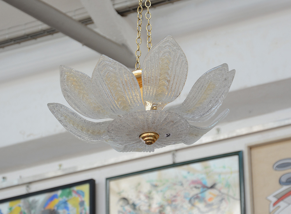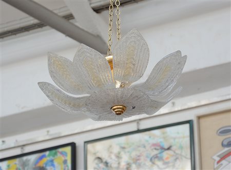 Plafoniera a tre luci con struttura in metallo ottonato e paralume a petali applicati in vetro corrugato. Produzione recente (d cm 52) (difetti)