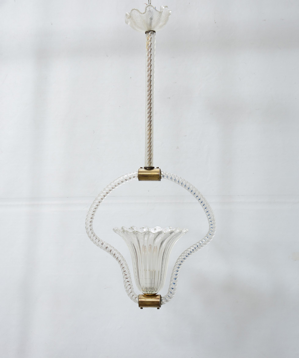 Manifattura di Murano, lampadario a una luce con montanti tubolari in vetro incolore torchon e paralume a campana costolata (h cm 84) (lievi difetti)