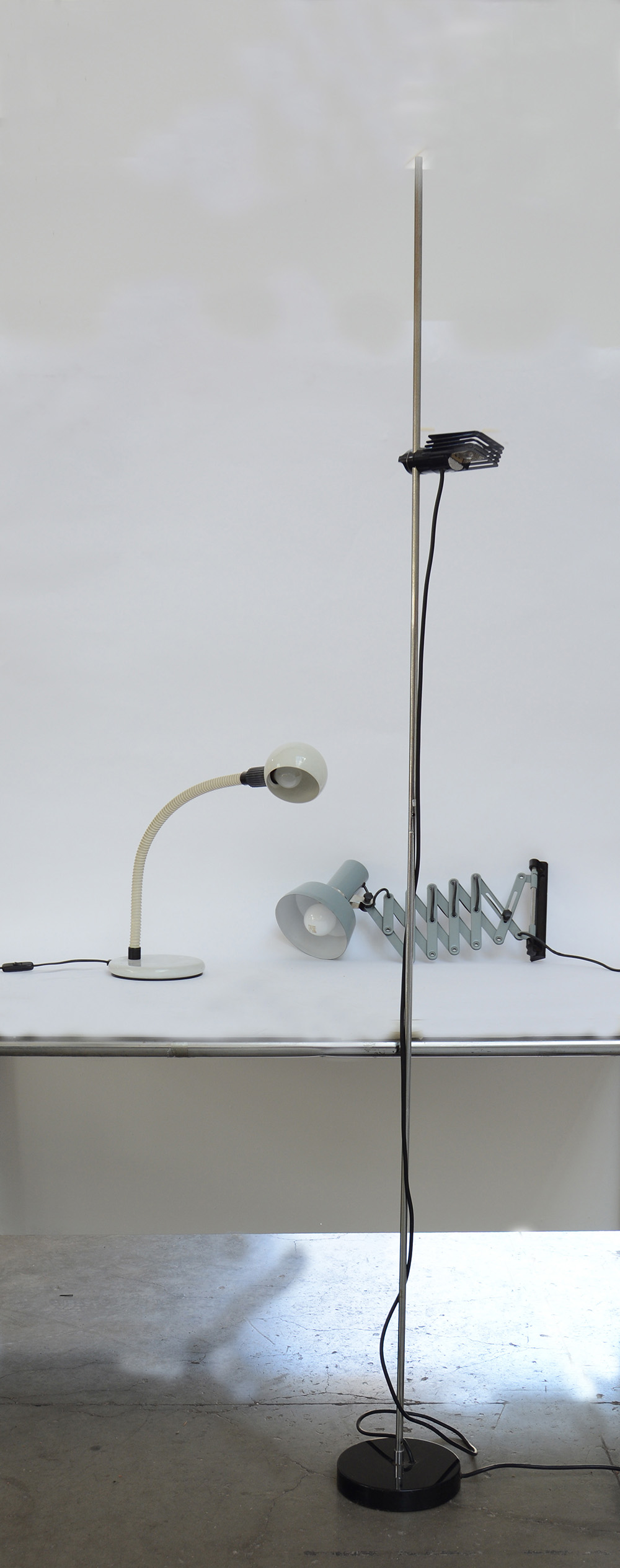 Bruno Gecchelin ( 1939 )Lampada da terra modello "Wing". Produzione O-Luce, Italia, 1971. Acciaio verniciato nero e cromato, plastica. Unita a una lampada da parete a pantografo in metallo verniciato grigio e una lampada da tavolo con paralume sferico laccato bianco (misure diverse) (difetti) Bibliografia per il modello "Wing": G. Gramigna, Repertorio del design italiano 1950-2000 per l'arredamento domestico, vol I, Allemandi, Torino 2003, p. 197