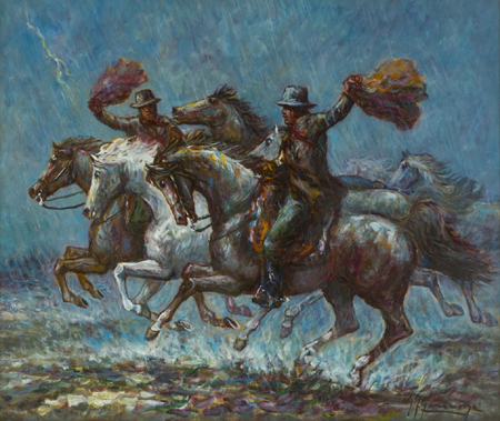 Giovan Franceso Gonzaga Milano 1921 - Milano 2007 Butteri e cavalli nella tempesta Olio su tela, cm. 56x66 Firmato in basso a destra. Sul verso: firma, titolo e cenni di provenienza. Autentica dell'Artista su foto.