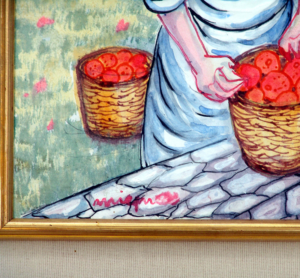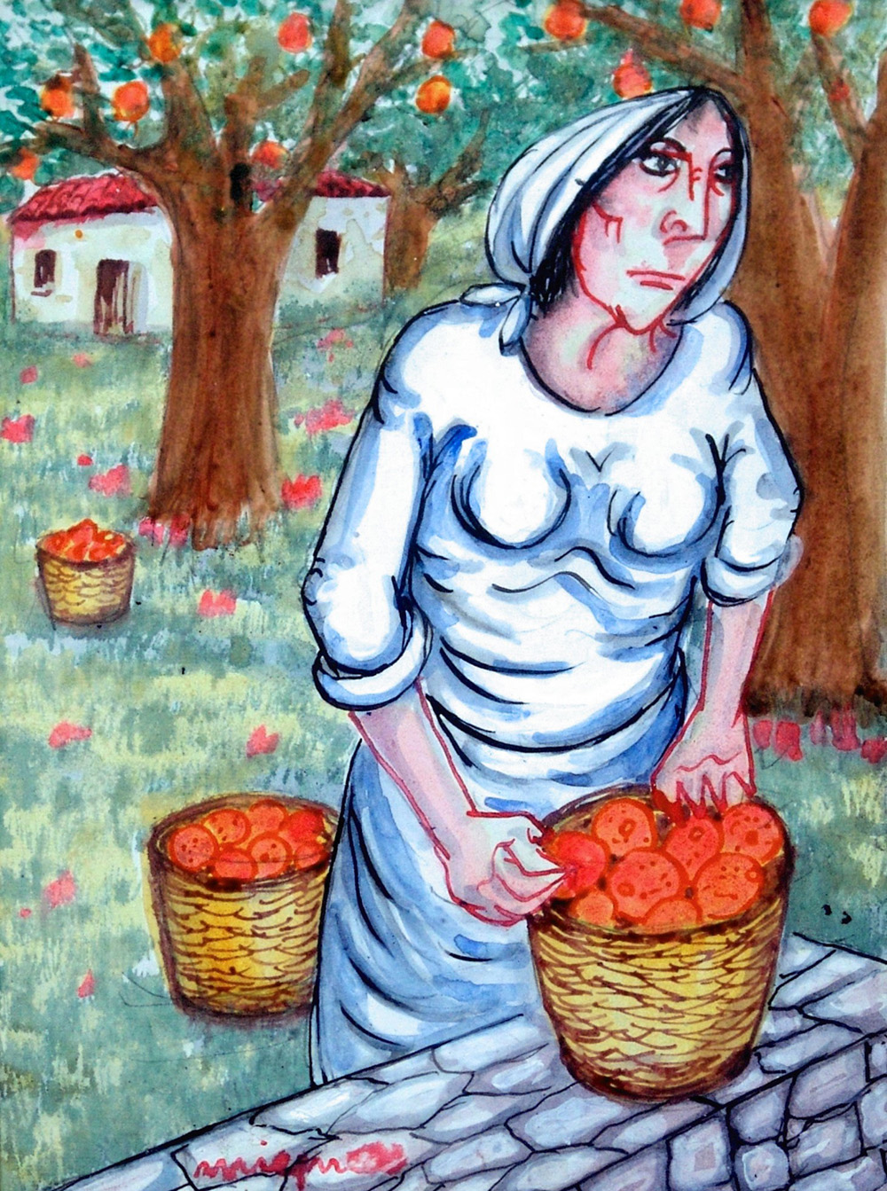 Giuseppe Migneco 1908, Messina (Me) - 1997, Milano (Mi) - [Italia] Raccoglitrice di agrumi china colorata su carta 29x21 cm 1992 firma dell’artista in basso a sinistra e sul retro; opera con cornice certificato di autenticità dell’artista su fotografia; archivio catalogo generale Giuseppe Migneco, Bonaparte Milano; timbro Galleria Rosini di Riccione