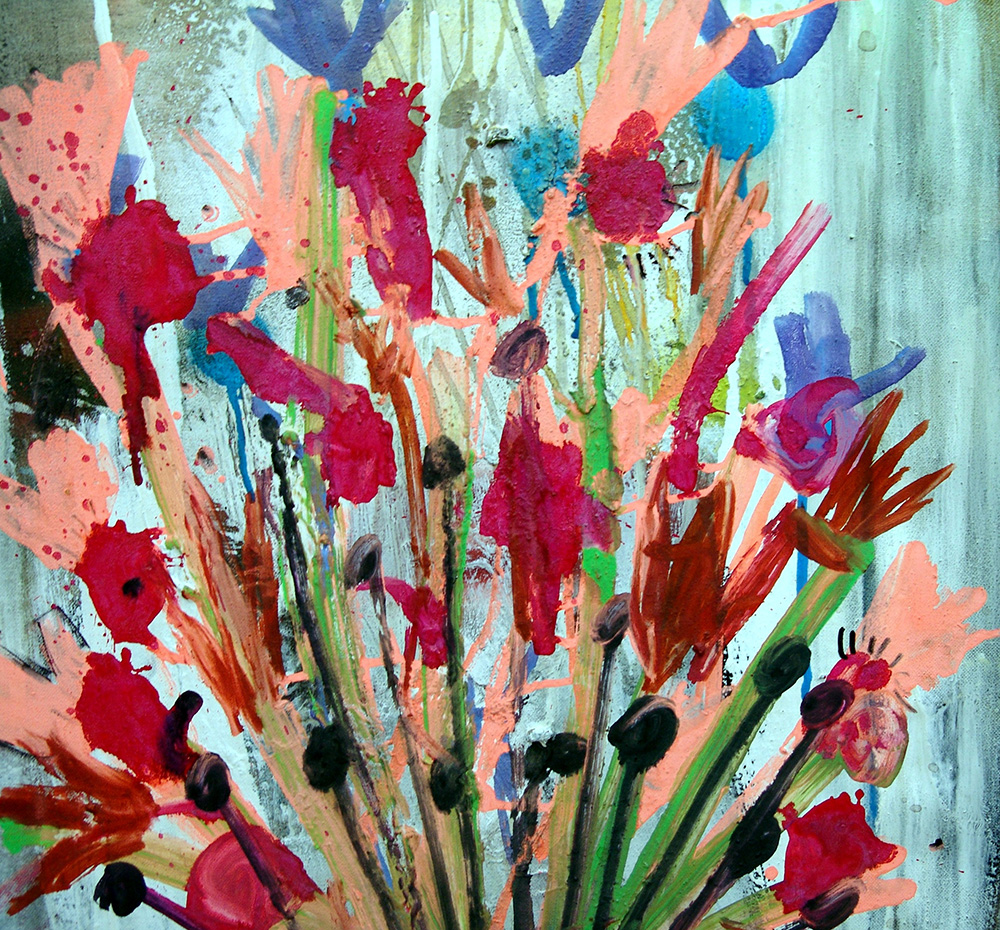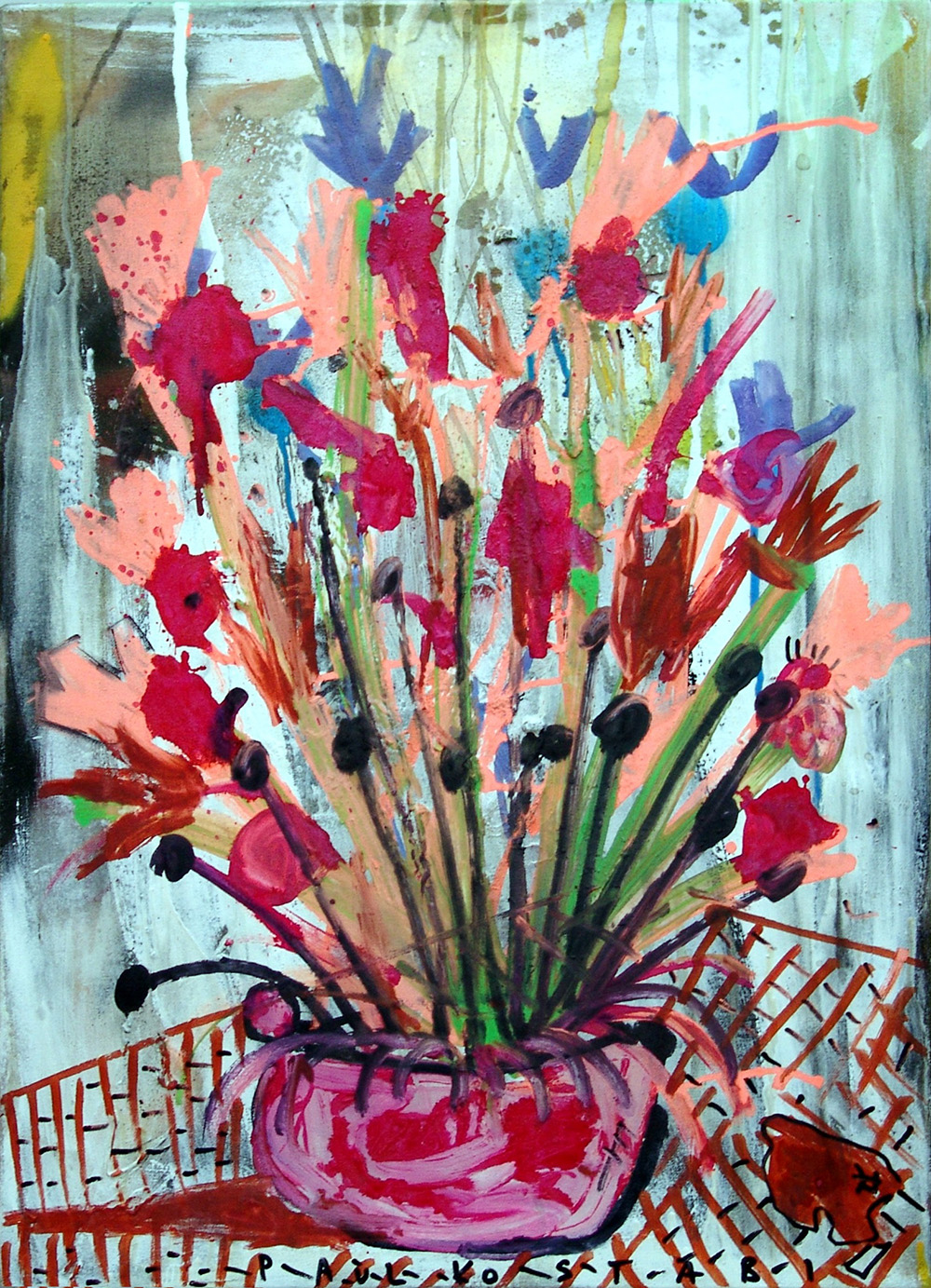 Paul Kostabi 1962, Whittier (California) - [USA] Flowers olio e acrilico su tela 70x50 cm 2015 firma dell’artista in basso al centro e sul retro certificato di autenticità firmato dall’artista