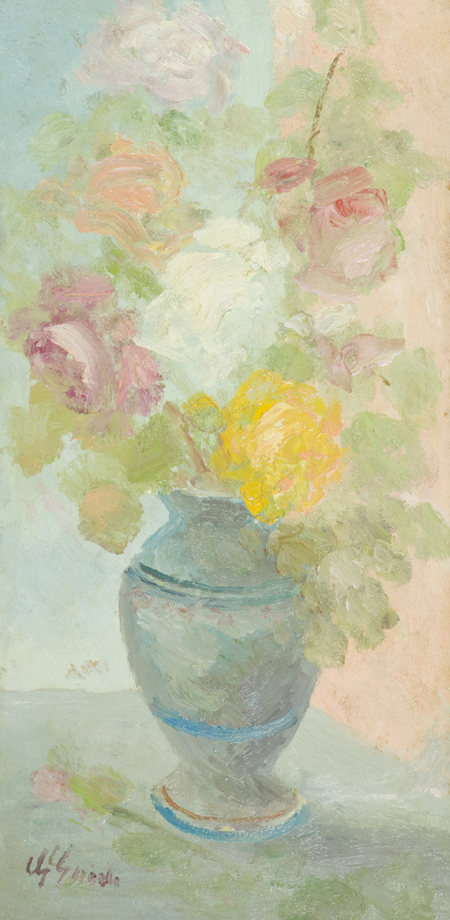 Guido Guidi Livorno 1901 - Livorno 1998 Vaso di fiori Olio su tavola, cm. 60x30 Firmato in basso a sinistra. Sul verso: timbro "Galleria d'Arte Carta e Cabras", Livorno.