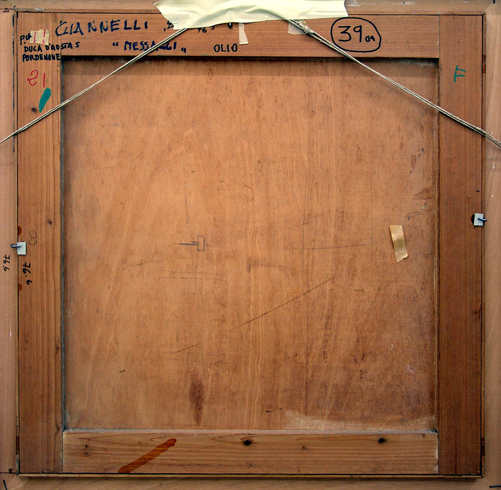 Angelo Giannelli 1922, Cecchini (Pn) - 2005, Pordenone (Pn) - [Italia] Messaggi olio su tela 76x76 cm 1988 firma dell’artista sul retro; opera con cornice certificato di autenticità Picenum