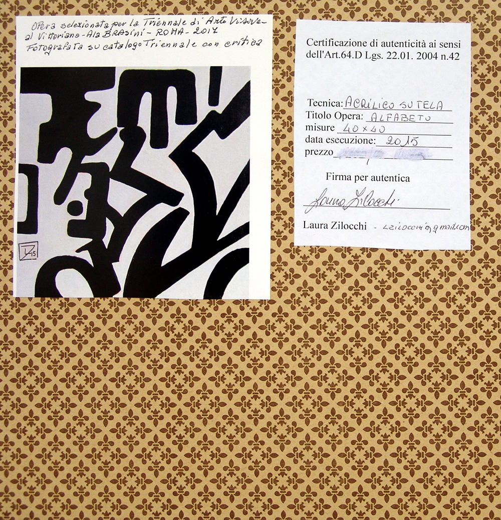Laura Zilocchi 1949, Guastalla (Re) - [Italia] Alfabeto acrilico su tela 40x40 cm 2015 firma dell’artista in basso a sinistra; opera con cornice certificato di autenticità firmato dall’artista