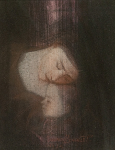 Giovanni Lorenzetti Lucca 1952 Maternità, 1974 Tecnica mista su tela, cm. 30x24 Firma e data in basso al centro.