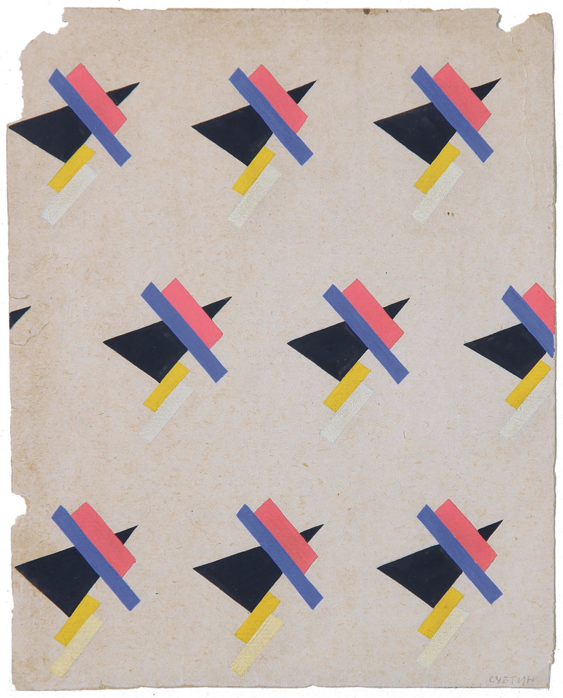 NIKOLAJ SUETIN 1897 - 1954 - Studio per tessuto, 1920/22, tempera su carta cm. 25x20, firma in cirillico in basso a destra, dichiarazione d'autenticità e provenienza del Sig. Mario Fissore (Antiquariato Il Cancello di Novara) su foto, presenta delle piccole mancanze ai margini e leggere imperfezioni alla carta.