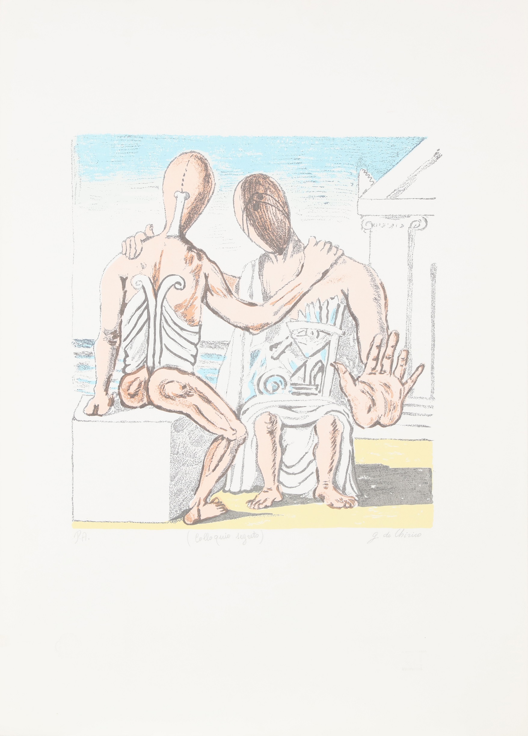 DE CHIRICO GIORGIO (1888 - 1978) Colloquio segreto. Litografia. Cm 50,00 x 70,00. P.a. Tiratura, titolo e firma a matita in basso. Timbro a secco Giorgio De Chirico in basso a sinistra. Timbro a secco a cura di Alberto Caprini Stampatore, Roma in basso a destra.