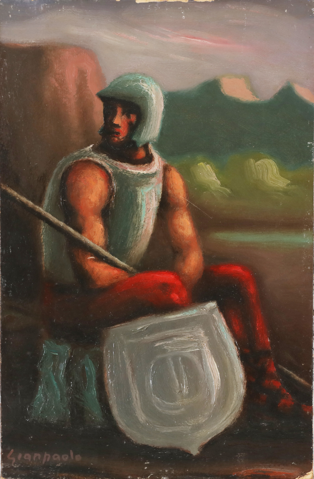 LAZZARO GIAMPAOLO (1911 - 1977) Guerriero. Olio su cartone pressato. Cm 20,00 x 30,00. Firma in basso a sinistra. Al retro firma e titolo.