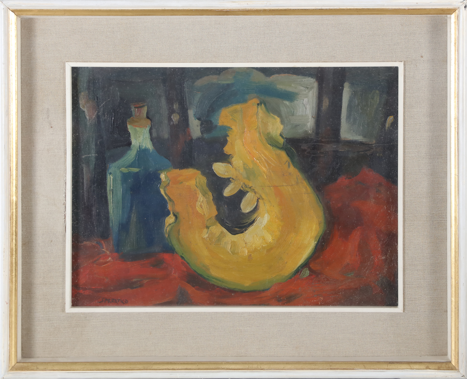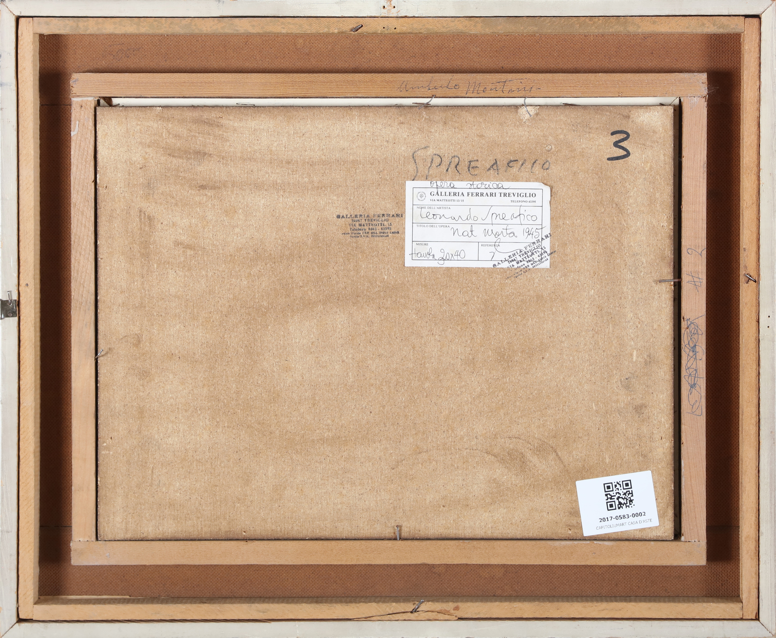 SPREAFICO LEONARDO (1907 - 1974) Natura morta. Olio su tavola. Cm 40,00 x 30,00. Firma in basso a sinistra. Al retro firma e cartiglio descrittivo e timbro della Galleria Ferrari, Treviglio. Cornice presente