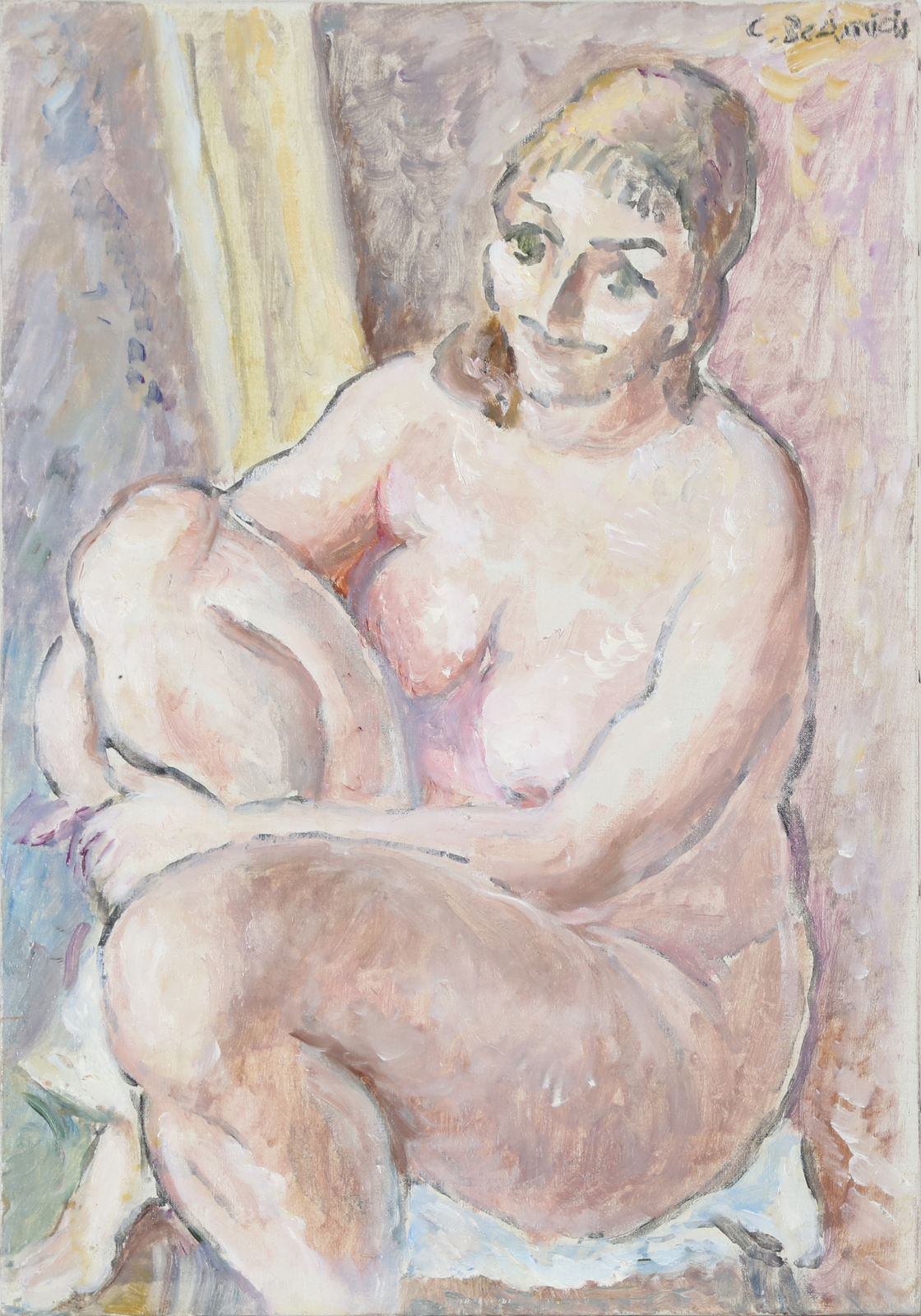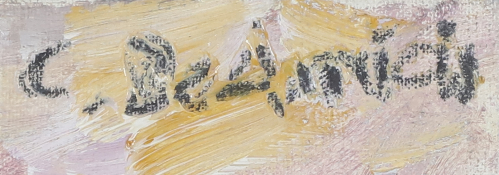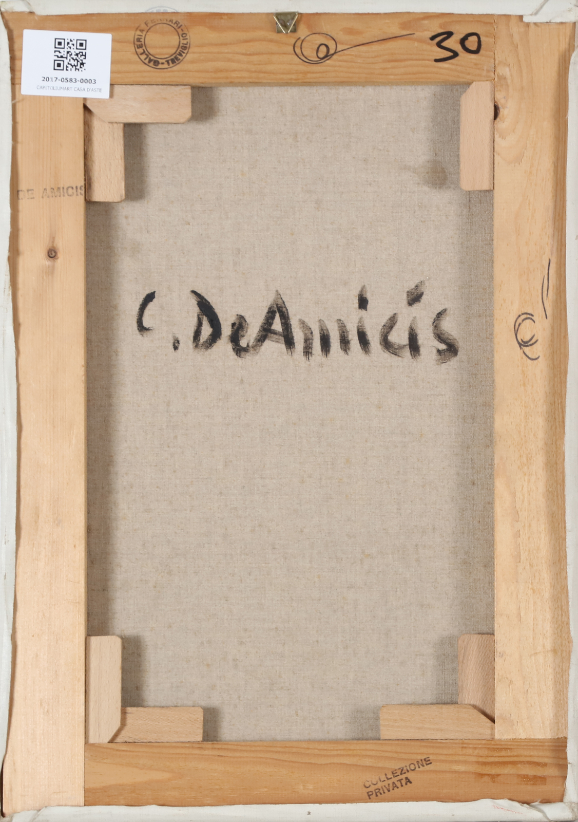 DE AMICIS CRISTOFORO (1902 - 1987) Senza titolo. Olio su tela . Cm 35,00 x 50,00. Firma in alto a destra. Al retro firma e timbro a cura della Galleria Ferrari, Treviglio.
