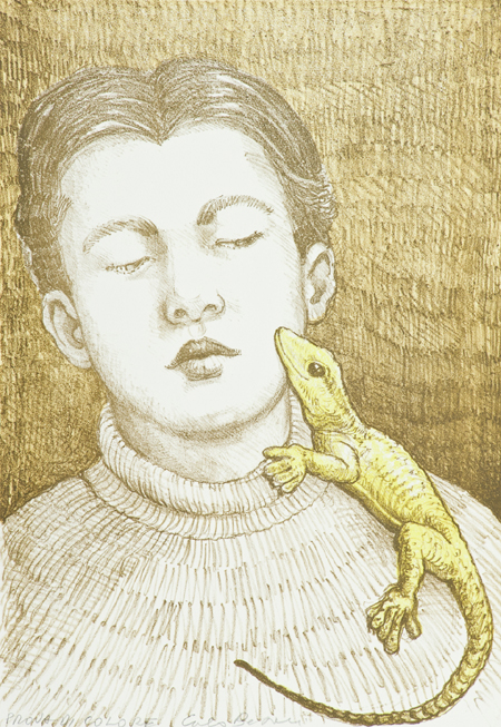 Carlo Bertocci Castell'Azzara 1946 Figura e geco Litografia su carta, cm. 50x35, es. P.A. Firmato in basso al centro.