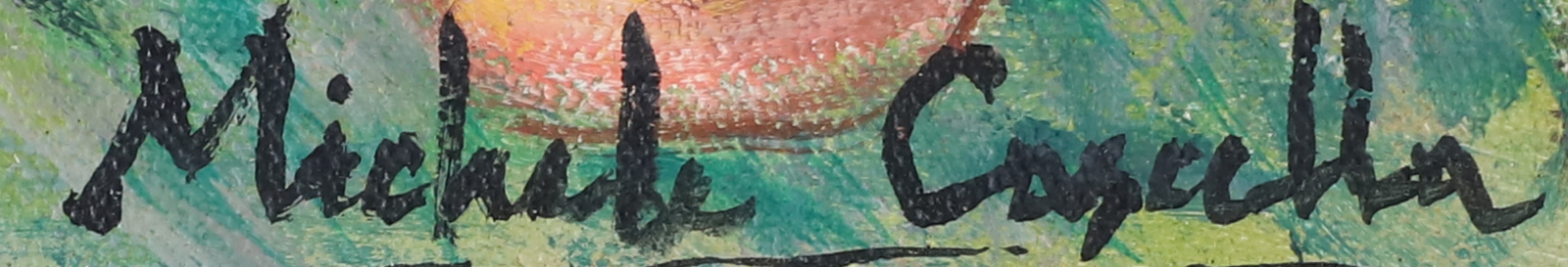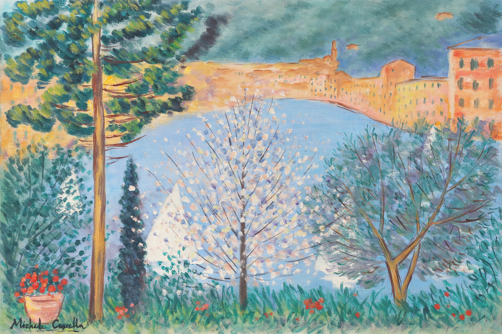 CASCELLA MICHELE (1892 - 1989) Portofino. . Olio su tela . Cm 60,00 x 40,00. Firma in basso a sinistra. Al retro firma per autentica. Opera archiviata presso l'Archivio generale dell'opera di Michele Cascella, come documentazione fotografica allegata all'opera riportante il relativo numero di inventario.1981-84. . Cornice presente