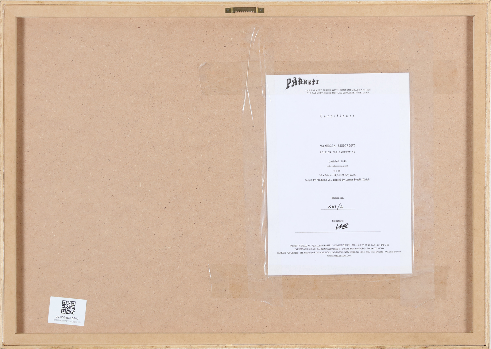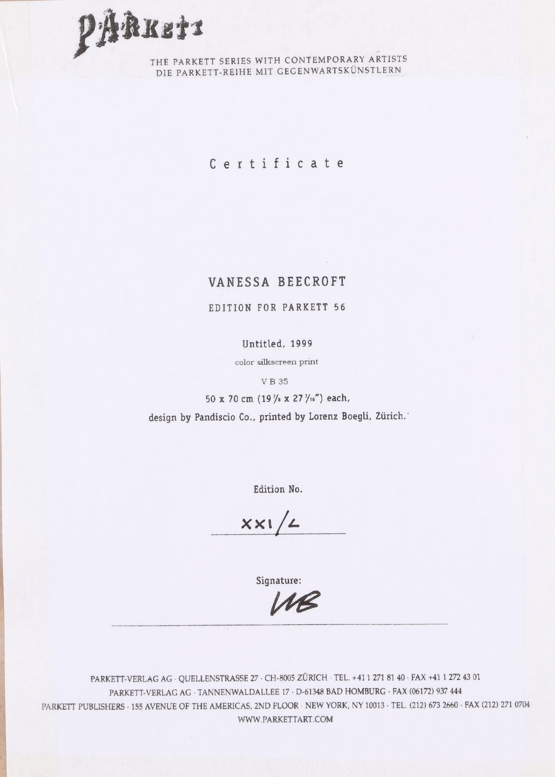 BEECROFT VANESSA (n. 1969) Senza titolo. 1999. Serigrafia. Cm 70,00 x 50,00. XXi/L, tiratura al retro. Firma in lastra in basso a destra. Al retro certificato di autenticità di Parkett Publishers, New York.