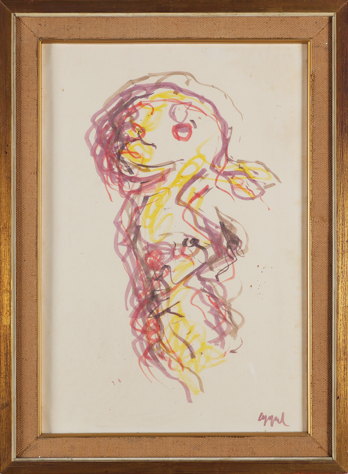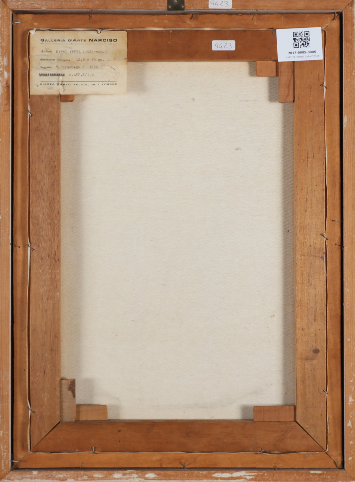 APPEL KAREL (1921 - 2006) ATTRIBUITO A. Personage. . 1966. Tecnica mista su carta. Cm 35,00 x 50,00. Firma in basso a destra. Al retro cartiglio descrittivo Galleria D'Arte Narciso, Torino. . Cornice presente