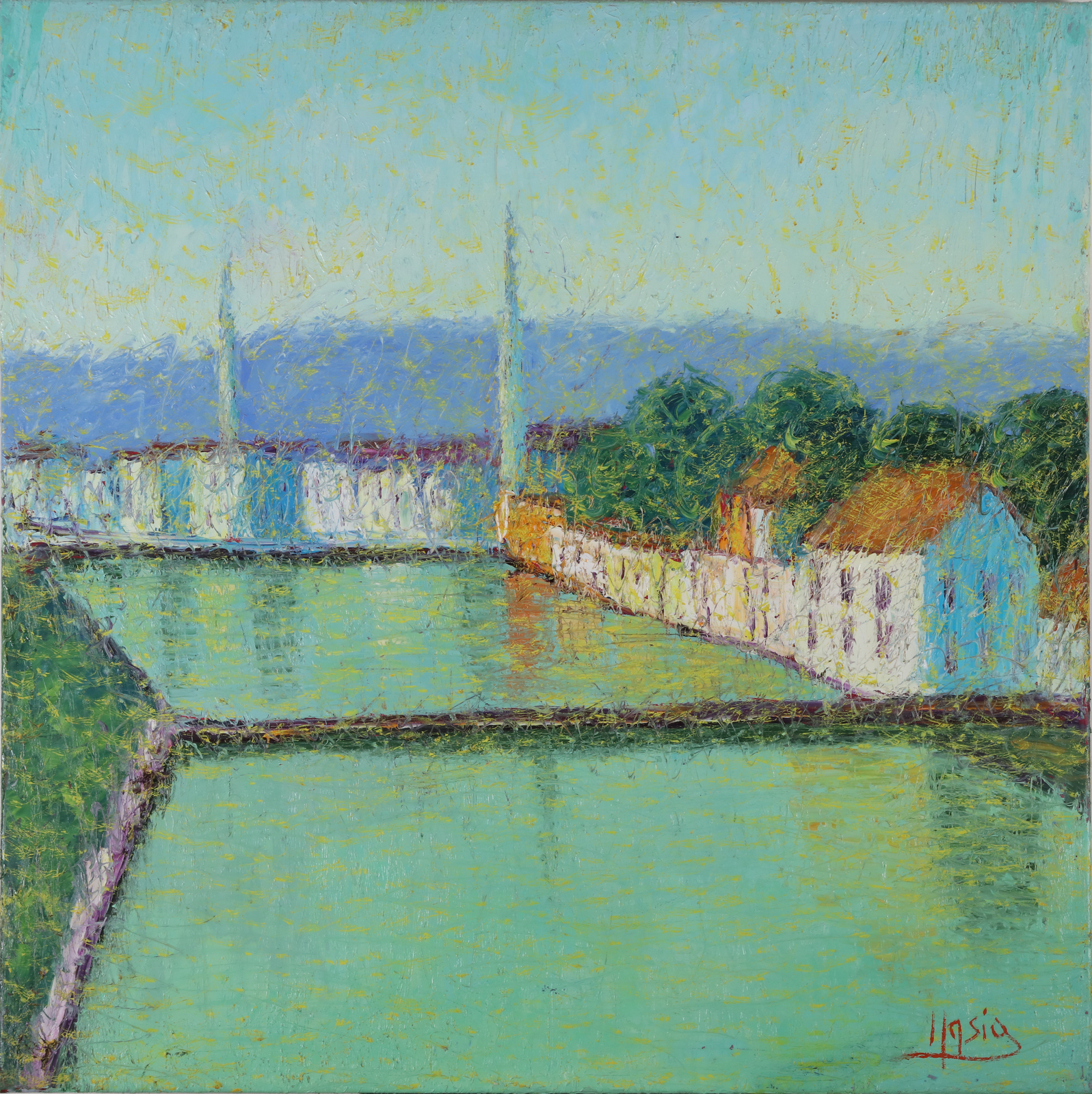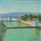 MASIA ROBERTO (n. 1958) Zurigo ( scorcio). . Olio su tela . Cm 100,00 x 100,00. Firma in basso a destra. Al retro titolo, firma per autentica. Timbro Arkadhia, Palermo.