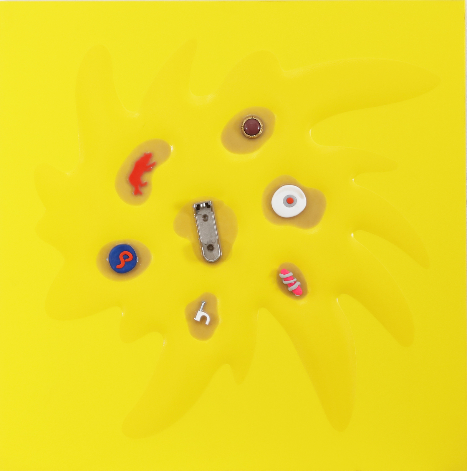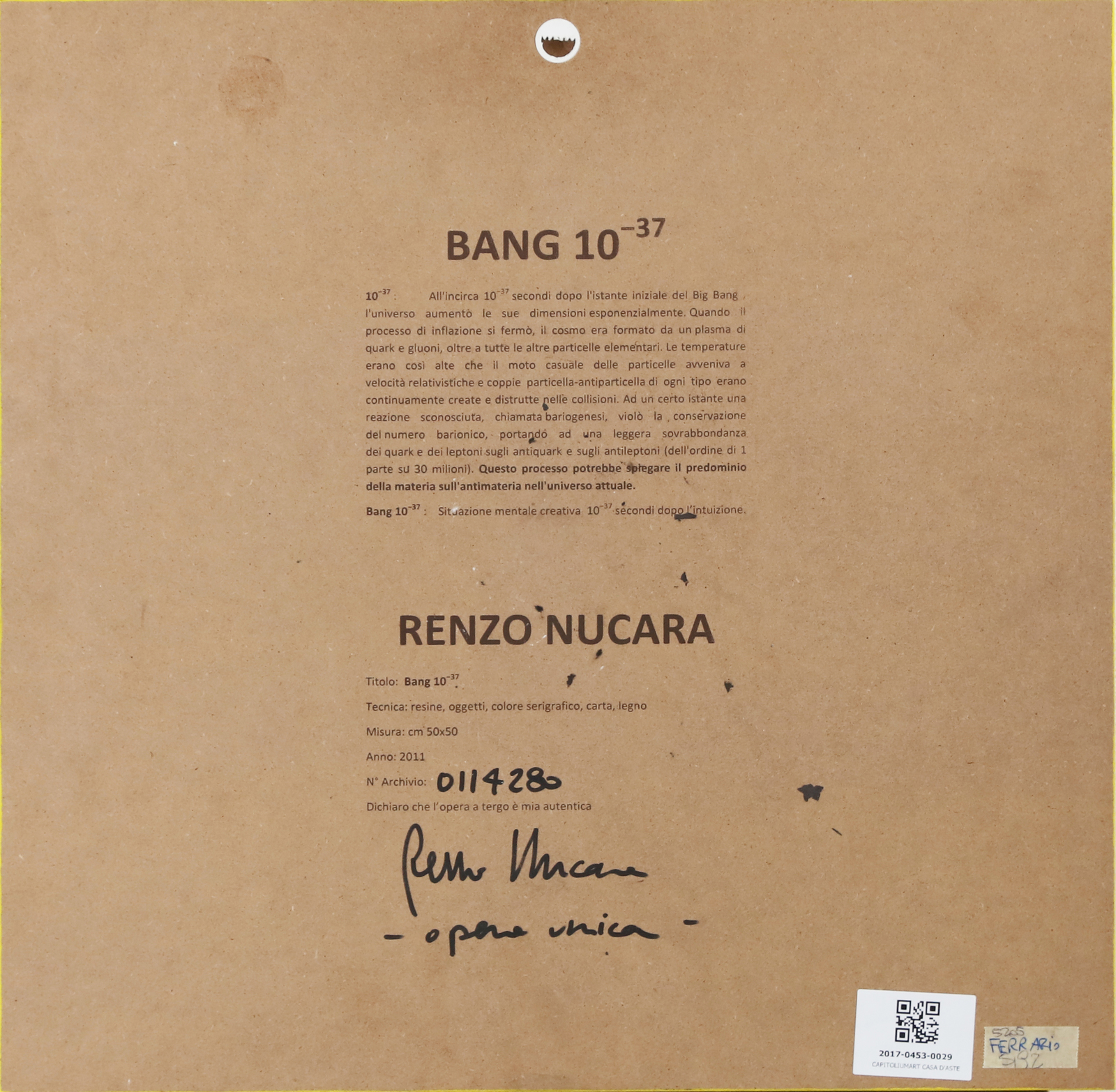 NUCARA RENZO (n. 1955) Bang. 2011. Tecnica mista su tavola. Cm 50,00 x 50,00. Al retro firma, titolo, anno. Opera contenuta in una teca di plexiglass. Autentica dell'artista su fotografia.